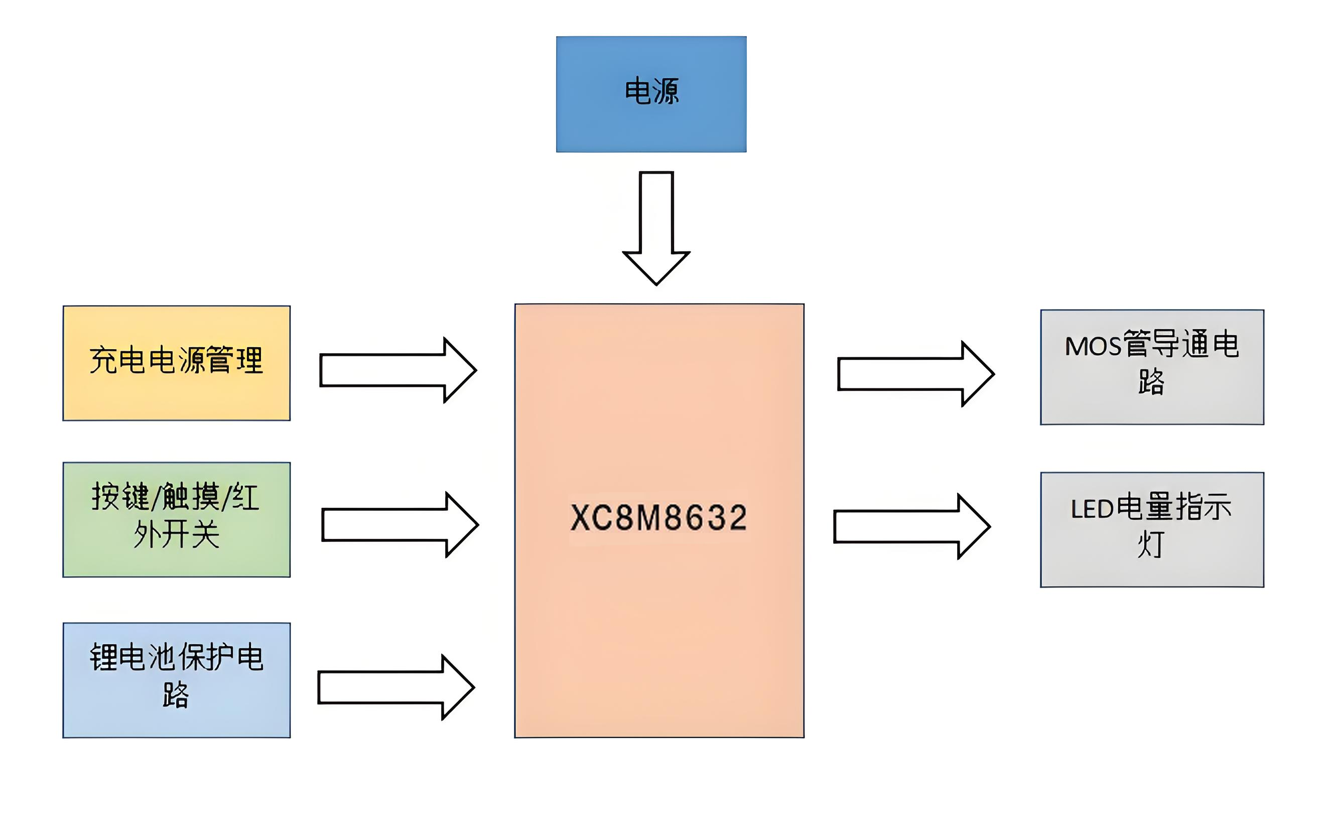 在本方案中,主控電弧打火機芯片采用矽杰微單片機XC8M8632,支持定制開發(fā)(比如:觸摸開關、紅外開關、電量顯示等),該點煙器芯片主要負責功能如下: