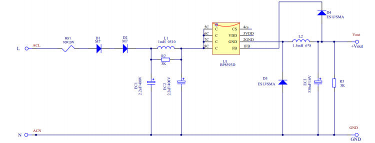 在智能家居、小家電、MCU待機供電等超小功率場景中,非隔離輔助電源因成本低、體積小、設(shè)計簡單而備受青睞。過去,OB2222E曾是這類100mA級方案的主流選擇,但受限于交期、價格及EMI裕量,工程師急需一顆直接替換、性能更優(yōu)的新品。BP8593D以 SOP7封裝、內(nèi)置700V MOS、PSR架構(gòu)、<100mW待機功耗為核心賣點,官方參考設(shè)計5V/100mA已完整驗證,BOM、PCB、測試數(shù)據(jù)一步到位,可實現(xiàn)零調(diào)試替代OB2222E。本文帶你一圖看懂這顆“小鋼炮”。